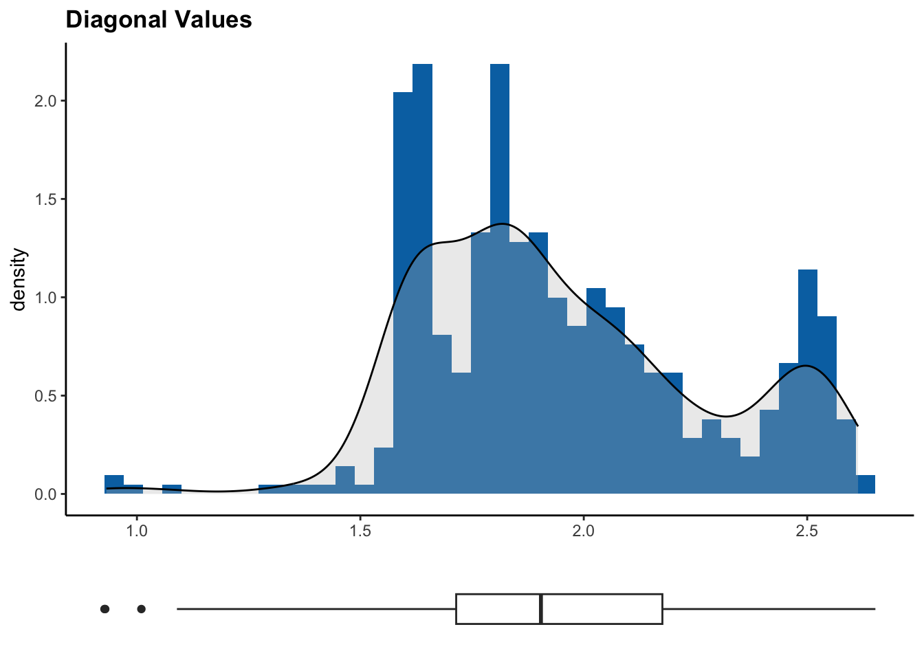We can use the results from our kinship matrix to identify potential duplicates within our data. The existence of duplicates in a data set can mean different things. A sample may be genotyped multiple times or accidentally re-entried as a new individual sample and it is important to identify these errors. However, we can also find cases where the samples belong to different individuals but present no genetic variation, which can hint towards inbred lines or clonal lines. Moreover, duplicates inflate sample sizes, which can give us false confidence on GWAS or other statistical analyses. We will use the kinshipDuplicates() function from our package, which returns a list object with our kinship matrix, a data frame with our potential duplicates, and plots of the distribution of diagonal and off-diagonal values from our kinship matrix.