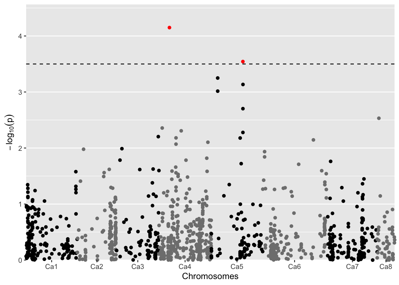 Prior to running our analysis, we need to compute a threshold by which to identify significant SNPs. The threshold for selecting significant SNPs in a GWAS analysis tends to be computed by using Bonferroni correction, with an alpha of 0.05. The alpha can be modified by setting the option alpha when calling the runSingleTraitGwas() function. Two other threshold types can be used: a fixed threshold (we set the thrType parameter to “fixed”) by specifying the log10(p) (LODThr) value of the threshold, or a small threshold (we set the thrType parameter to “small” and nSnpLOD to n) which defines the n SNPs with the highest log10(p) scores as significant SNPs.