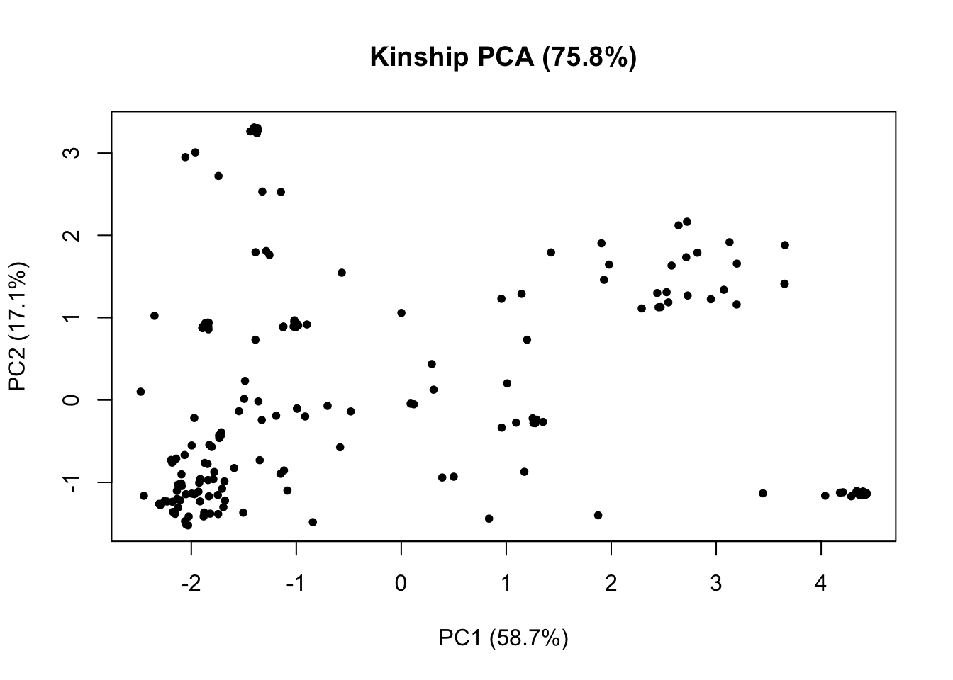 A kinship matrix was produced and used in the GWAS analysis. The method for producing this matrix can be defined by thge kinshipMethod parameter in the runSingleTraitGwas() function. By default, the same kinship matrix is used for testing all SNPs (GLSMethod = “single”). When GLSMethod = “multi”, the kinship matrix is chromosome-specific. As shown by Rincent et al.(2014), this often gives a considerable improvement in power.