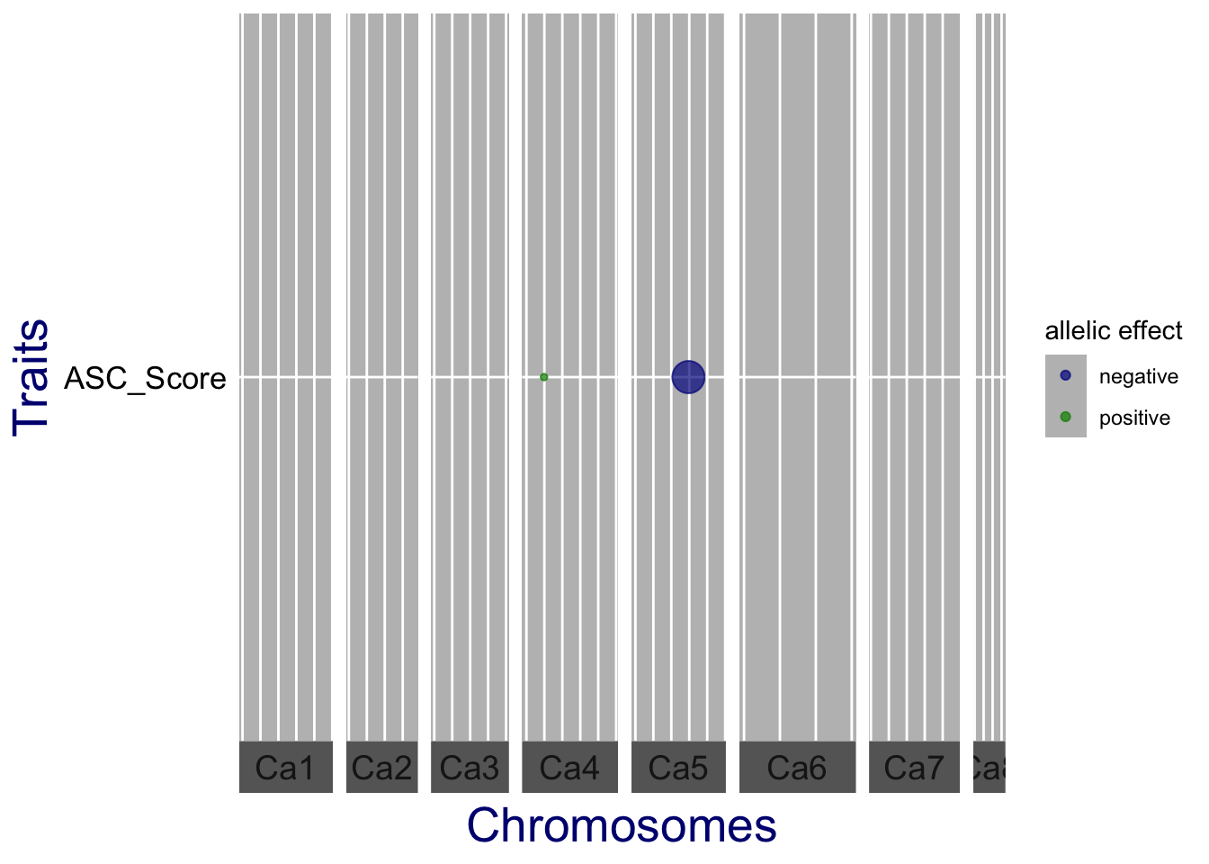 A qtl plot of GWAS. The significant SNPs are marked by circles at their genomic positions, with diameter proportional to the estimated effect size. Colors indicate the direction of the effect: green when the allele increases the trait value, and blue when it decreases the value.